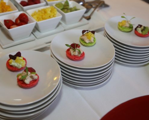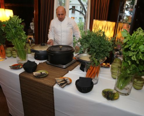 L’accueil du Chef dans la verrière, le Méli-Mélo du Jardin sur les terrasses, les pièces chaudes cuisinées sur place au premier étage baptisé « Chaud Devant », les desserts et son animation « macarons » dans les 2 magnifiques suites du 2ème étage et un dernier verre de champagne dans la suite de luxe… ponctués par une soirée dansante…